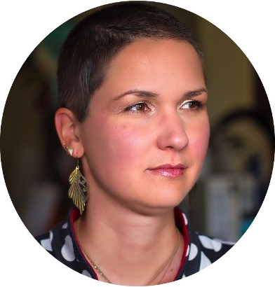 Portrait of Karina Sturm with short hair looking slightly to the side, wearing a patterned top and a gold leaf-shaped earring, with a softly blurred indoor background.
